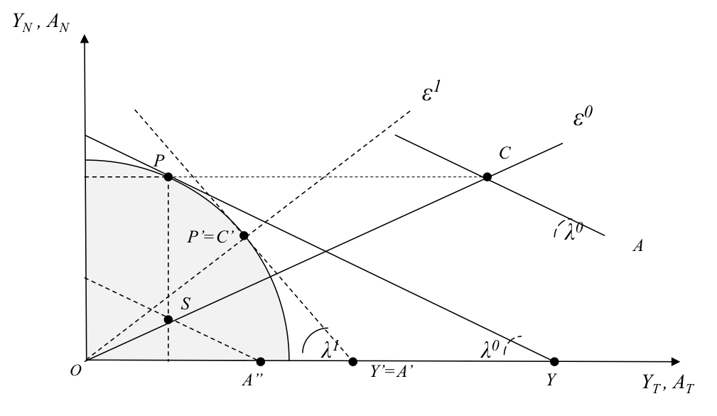 The case with nominal stickiness is described in Figure 1 by point S. In this case, nominal wages and non-tradable good prices fail to decline, so the slope of domestic absorption remains unchanged. Thus, production of tradable goods remains stuck in P, consumers remain attached to the original Engel curve and domestic absorption is required to fall much more in order to meet the external balance (A’’). In the new consumption point (S), the demand for non-tradable goods falls short the potential supply (P), so unemployment soars up, proportional to the distance between S and P. Employment fails to be absorbed by tradable good industries, because firms don’t see the relative price of tradable goods increasing. In the non-tradable goods sector, the employment contraction overshoots what is required in the long run.